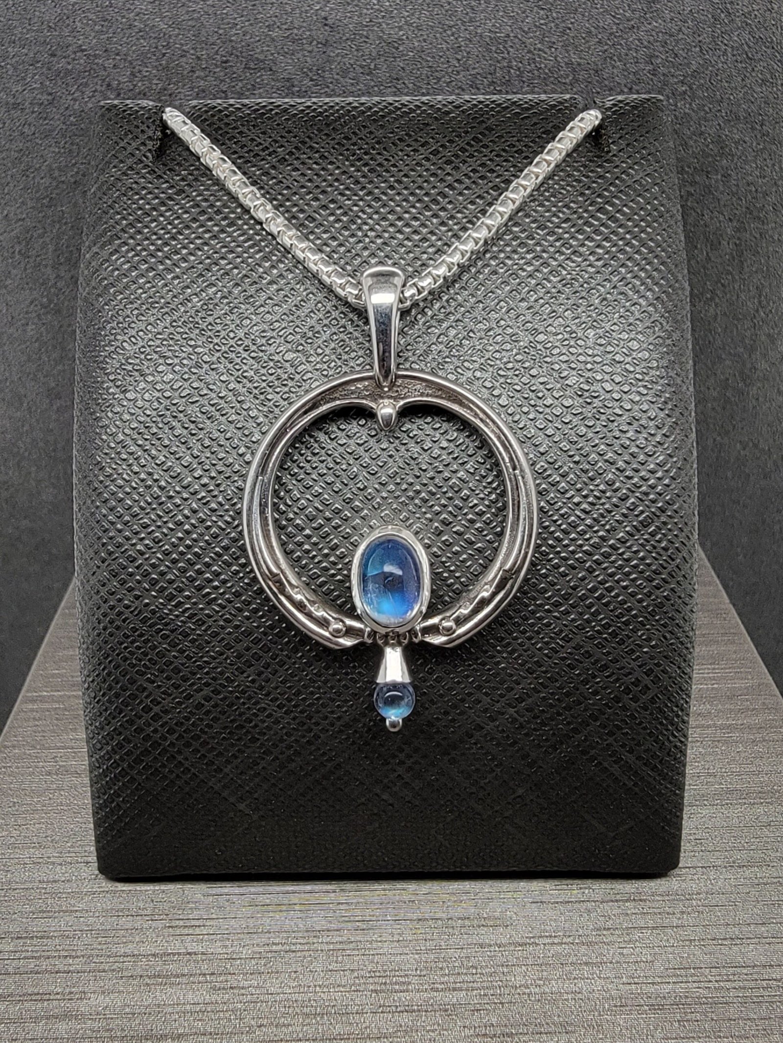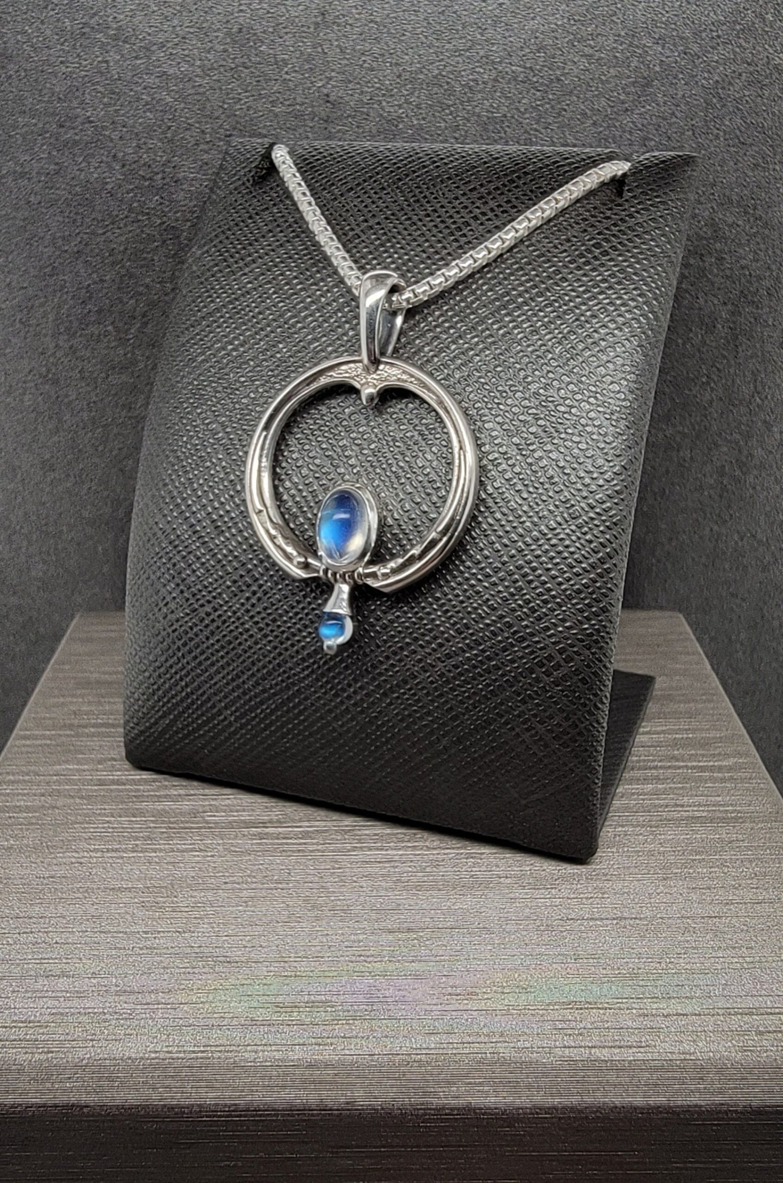 Moonstone has been used in jewelry for centuries and is valued for its visual depth and subtle iridescence. The blue sheen moonstone selected for this piece enhances the contrast between the stone and the silver setting, emphasizing clarity and balance in the overall design.