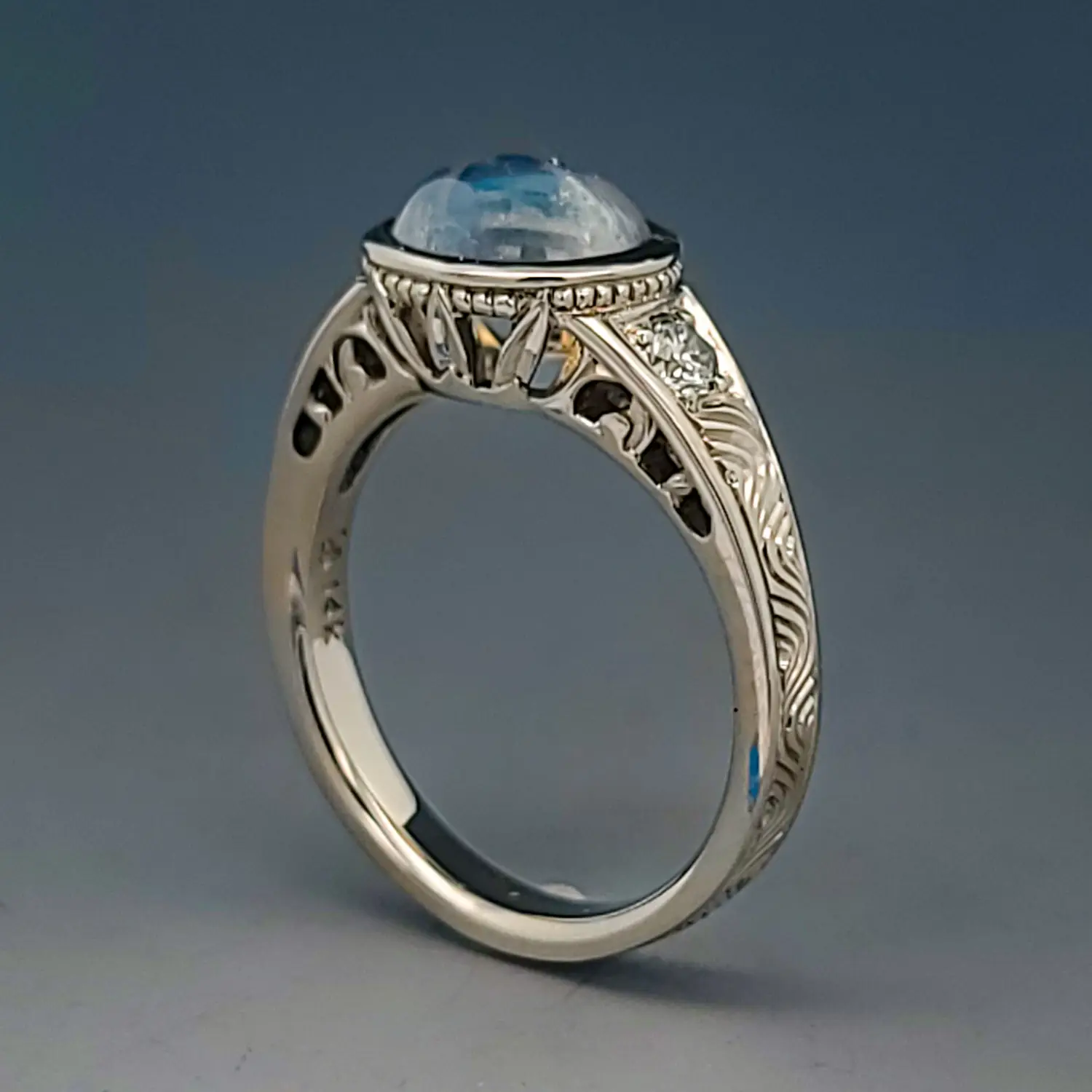 A luminous moonstone set in 14K gold, hand-engraved on-site by Ben Stewart and Kathryn Holton Stewart. Timeless design and heirloom-quality craftsmanship for everyday elegance or a cherished gift.
